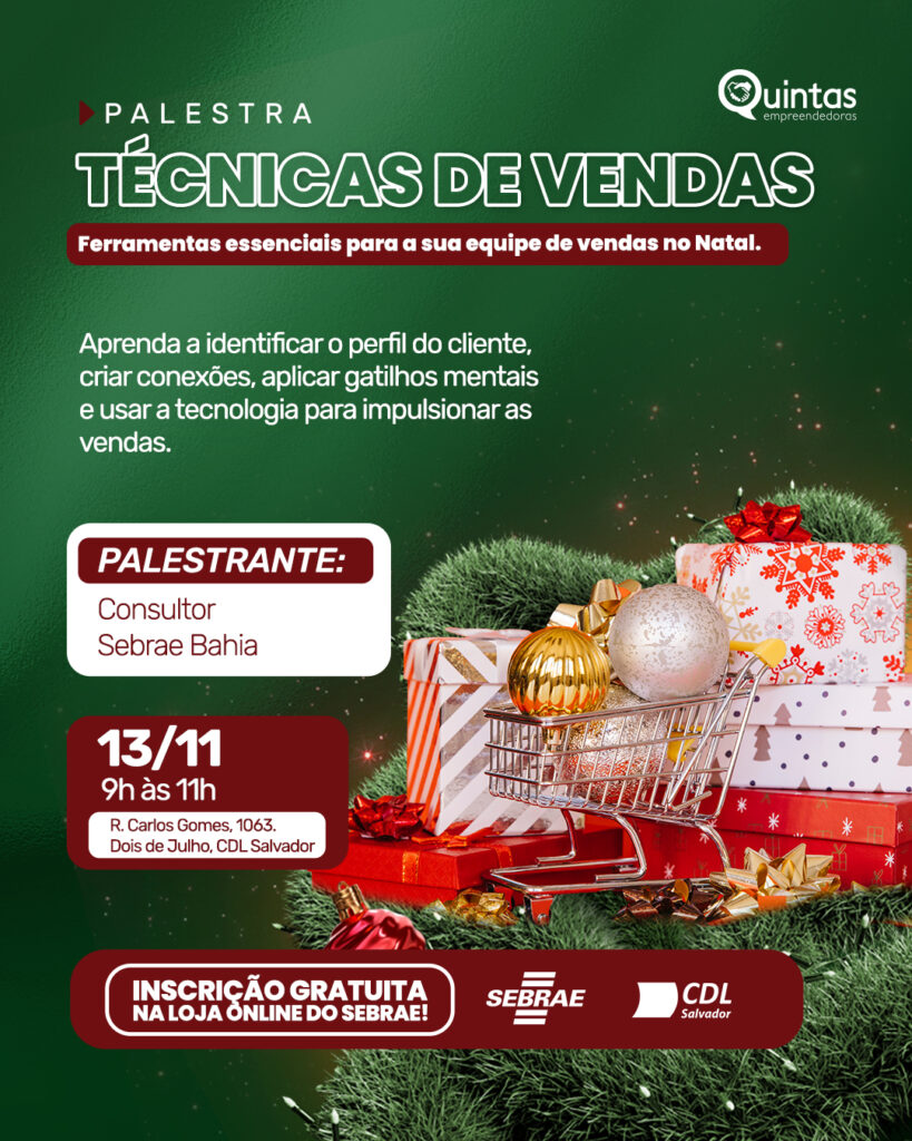 O Sebrae Bahia e a CDL Salvador convidam você para a palestra “Técnicas de Vendas – Ferramentas Essenciais para a Sua Equipe de Vendas no Natal”.