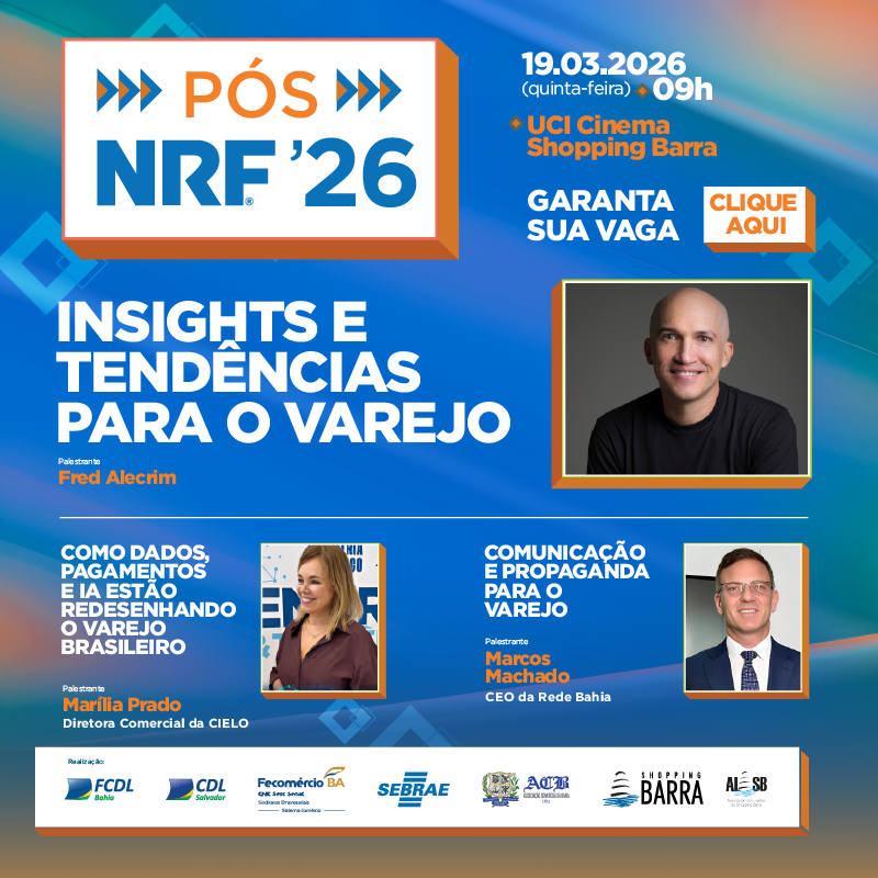 A FCDL Bahia, CDL Salvador, Fecomércio BA, Sebrae,ACB- Associação Comercial da Bahia,Shopping Barra e ALSBarra, convidam você para a Palestra Pós NRF 2026, um encontro especial que trará os principais insights do NRF Retail’s Big Show, o maior evento de varejo do mundo, realizado anualmente em Nova York.